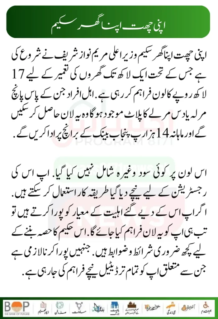 Chief Minister Maryam Nawaz Sharif has started the Apni Chhat Apna Ghar scheme, under which she is providing a loan of 17 lakh rupees for the construction of up to 100,000 houses. Eligible persons who have a plot of five or ten marlas will be able to get this lawn and will pay 14 thousand rupees per month at the Punjab Bank branch.