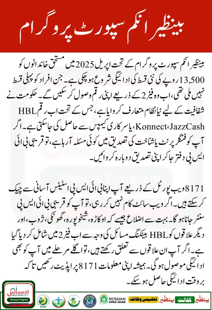 8171 Web Portal makes it simple and secure for registered families to check their Rs. 13500 BISP payments online. With multiple methods like SMS, helpline, and office visits, you can easily stay updated. If you haven’t registered yet, complete your survey and apply now to benefit from this monthly support.