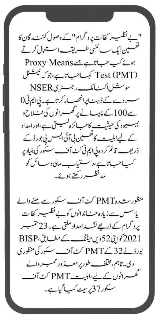 Families meeting or exceeding the approved PMT cut-off score receive cash assistance through the Benazir Kafaalat Programme. As of its 52nd meeting on September 23, 2021, the BISP Board approved a PMT cut-off score of 32. However, for households with a differently abled member, the eligibility PMT cut-off score is set at 37.
