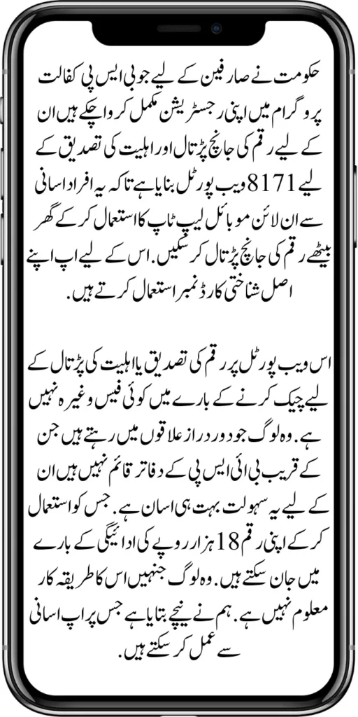 The government has created an 8171 web portal for verification of eligibility and eligibility for users who have completed their registration in the BISP Kafaalat program 18000 so that they can easily apply online using mobile laptops. Can check money sitting at home. For this, you use your original ID card number. There is no fee on BISP 18000 payment, etc.