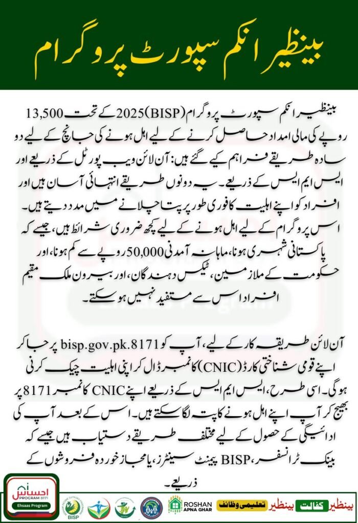 The BISP 8171 program continues to serve as a vital source of financial assistance for those in need. By following the simple steps outlined in this guide, you can quickly determine if you are eligible for the Rs. 13,500 payment. Whether you check online through the official web portal or via SMS, both methods are efficient and user-friendly.