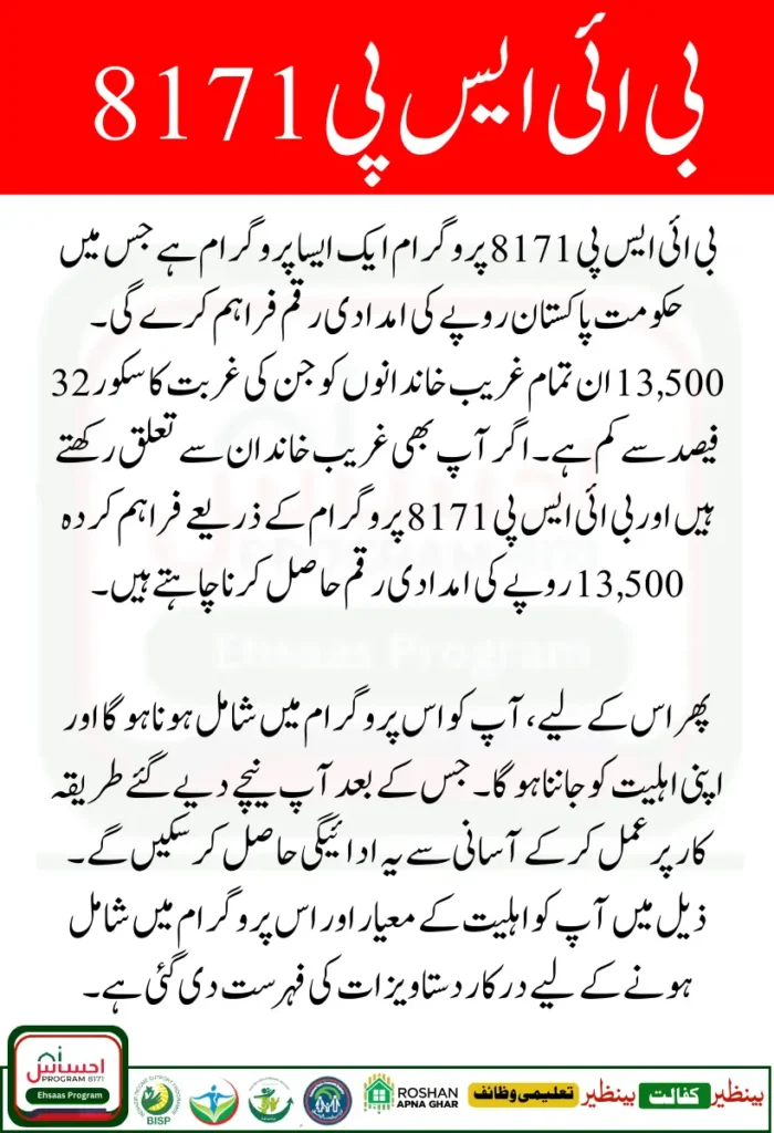 BISP 8171 program is a program in which the Government of Pakistan will provide an assistance amount of Rs. 13,500 to all poor families whose poverty score is less than 32 percent. If you also belong to a poor family and want to get the assistance amount of Rs. 13,500 provided by the BISP 8171 program.