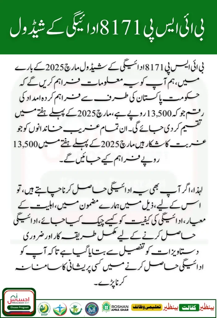 Details about the payment release date and schedule of the BISP 8171 program Rs 13,500 have been explained to you. This payment was released on March 2025, and this payment will be provided to all eligible beneficiaries in the first week of March 2025. So complete your registration and get this assistance amount.