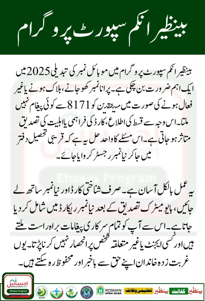 According to the BISP 8171 update 2025, beneficiaries can only change their mobile number by visiting the nearest BISP tehsil office. Online or SMS-based number change is not possible, because biometric verification is required for security reasons.