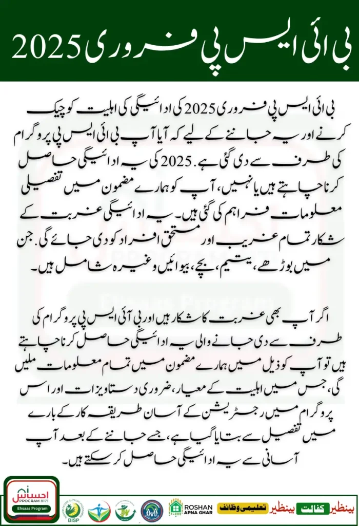 To check the BISP February 2025 payment eligibility and to find out whether you want to get this 2025 payment given by the BSP program or not, you have been provided with detailed information in our article. This payment will be given to all the poor and deserving people who are suffering from poverty, including the elderly, orphans, children, widows, etc.