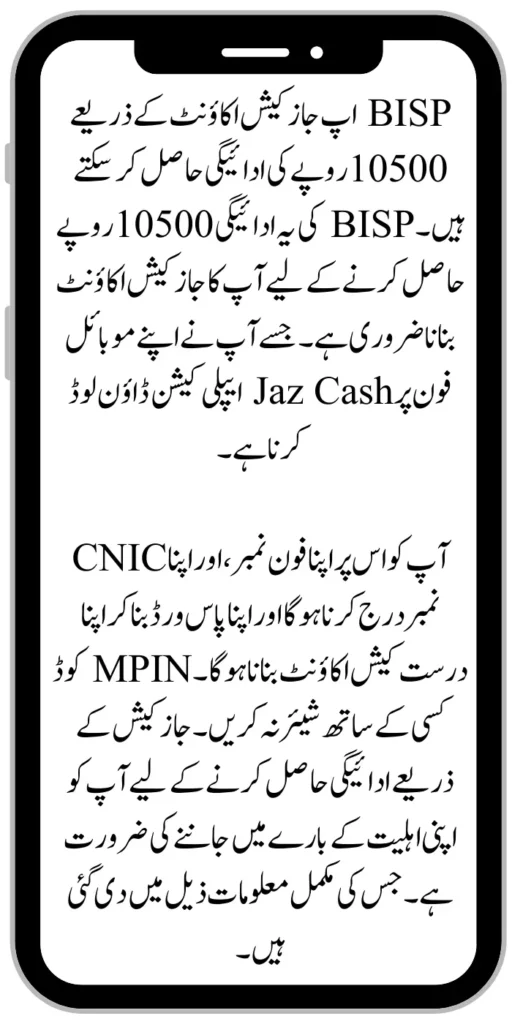 BISP can get payment of Rs.10500 through the Up Jazz Cash Account. To get this payment of BISP Rs.10500 your Jazz Cash account must be created. Which you have to download the Jaz Cash application on your mobile phone.