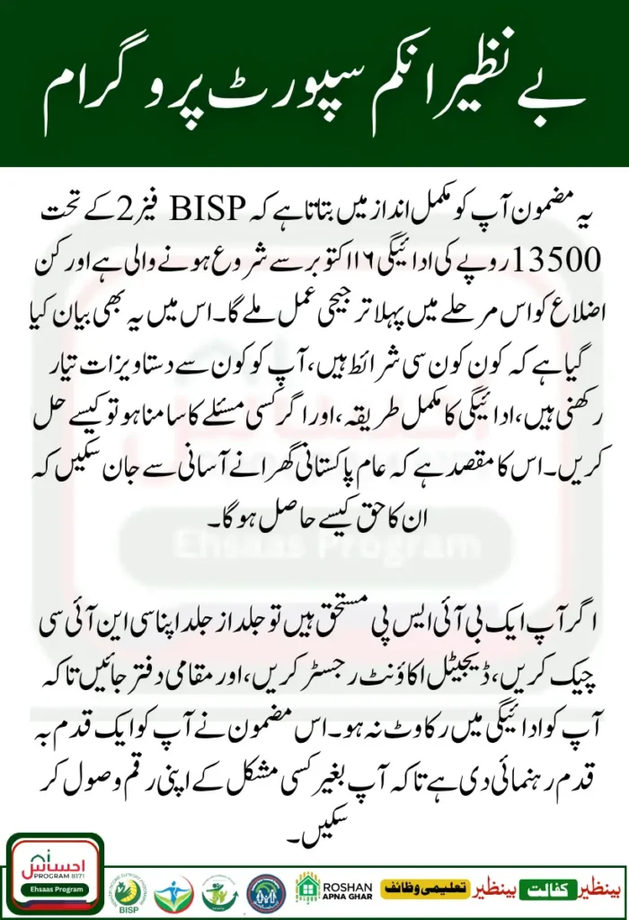 For your name to appear in Phase 2 of the Rs 13,500 BISP payment, you typically need to satisfy: