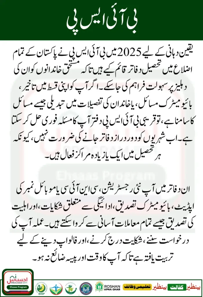 To ensure that no eligible person is left behind, BISP has opened Tehsil offices in almost every district of Pakistan. These offices serve as direct support centers for new applicants and current beneficiaries.