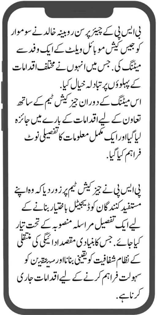 BSP Chairperson Rubina Khalid held a meeting with a delegation of Jazz Cash Mobile Wallet on Monday. In which he discussed the aspects of various measures. During this meeting, the measures for cooperation with the Jays Cash team were reviewed and a detailed information note was provided.