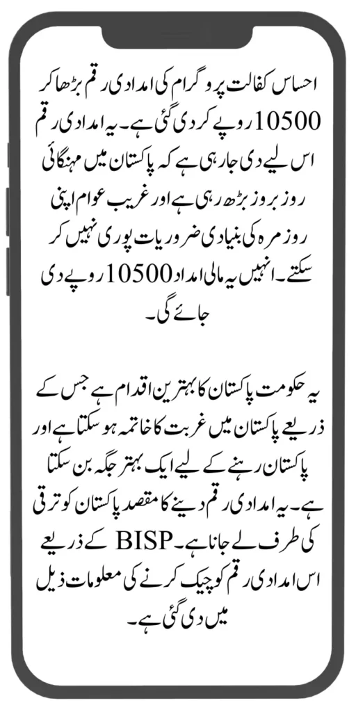 You can use BISP to check Ehsaas Kafaalat 10500. Through BISP you can check whether you can get this amount of Rs.10500 or not. To check this amount from BISP, you have to go to the BISP office near your home and check your eligibility by giving your National Identity Card number there. All the information about its eligibility criteria is given to you below.