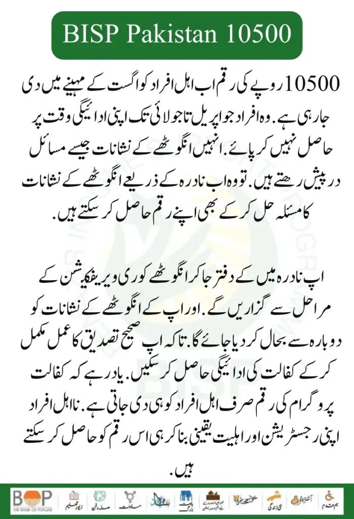 An BISP Pakistan 10500 Payment is now being given to the eligible people in August. Those who did not get their payment on time from April to July. They face problems like thumbprints. So now they can get their money by solving the issue of thumbprints through NADRA. You will go through the steps of thumb re-verification by going to the office in Nadra.
