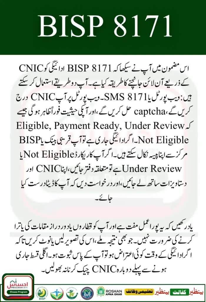 In November 2025, checking BISP 8171 payment by CNIC online is the fastest, safest way to know your stipend status. Use the official web portal or SMS 8171 with your correct CNIC. If status is unfavorable, visit your BISP office with documents and get your survey / data corrected. Always collect once status shows ready,carrying your original CNIC.