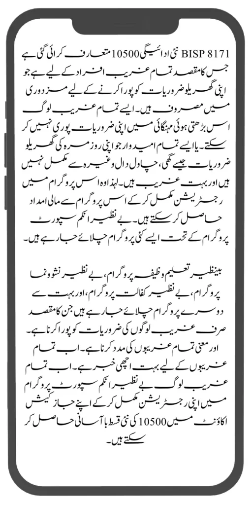 BISP 8171 New Payment 10500 has been introduced which is aimed at all poor people who are engaged in labour to meet their household needs. All such poor people cannot meet their needs in this rising inflation. Or all such candidates who are not complete with their daily household necessities like ghee, rice pulses etc. and are very poor. So they can get financial assistance from this program by completing the registration in this program. Under the Benazir Income Support Program, many such programs are being run.