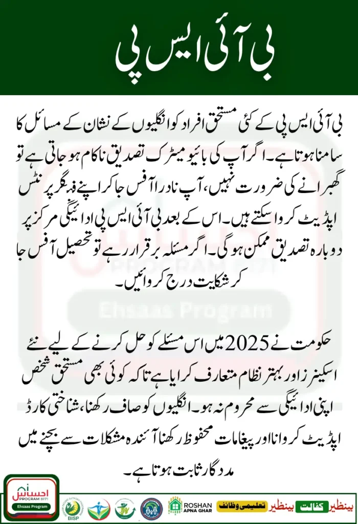 Most cases are resolved either through NADRA fingerprint updates or by visiting the BISP Tehsil Office. Remember, this system is made to protect your rights, not to make things harder. Keep your CNIC updated, take care of your hands, and never give up your payment to anyone else.