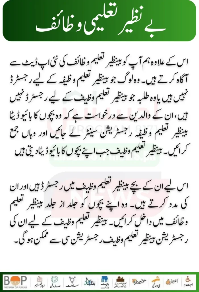 Now, the Bank of Punjab will provide a Benazir Taleemi scholarship. So, those women who have received the SMS should go to the Bank of Punjab retailer representative as soon as possible and get the stipend by having their thumbs verified.