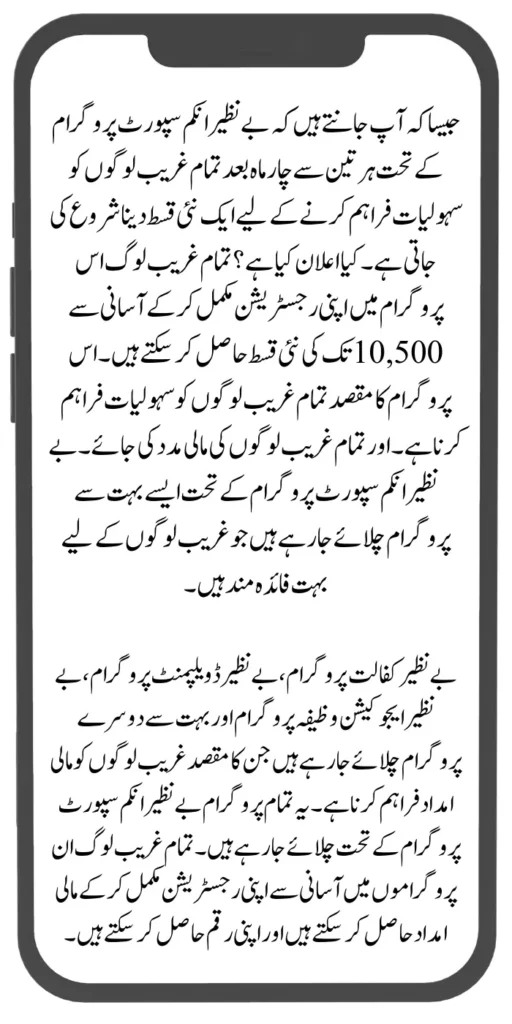 As you know, every three to four months under the Benazir Income Support Program, a new instalment is started to be given to provide facilities to all the poor people. What is announced? All poor people can easily get a new instalment amount of up to 10,500 by completing their registration in this program. The objective of this program is to provide facilities for all poor people. And to provide financial assistance to all the poor people. Many such programs are being run under the Benazir Income Support Program which are very beneficial for the poor people.